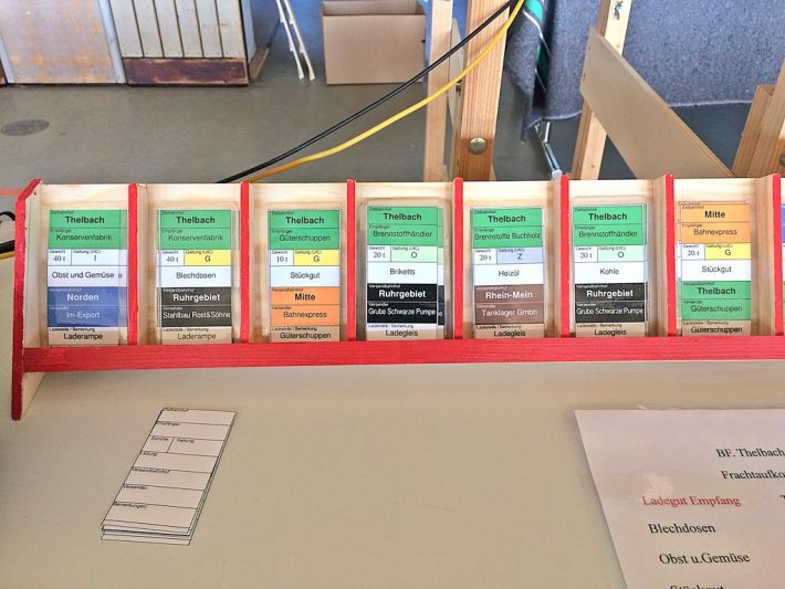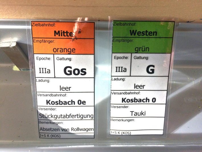 Erneut wurde mit Wagen- und Frachtkarten der Betrieb abgewickelt. Bei der Schmalspur war die noch nicht so konsequent umgesetzt aber auch mit provisorischen oder Blanko-Karten wurden Transporte generiert. Sehr intensiv wurden auch die Übergaben der Regelspurwagen ins Schmalspurland betrieben. Knapp 10 Rollwagen waren so im Einsatz.