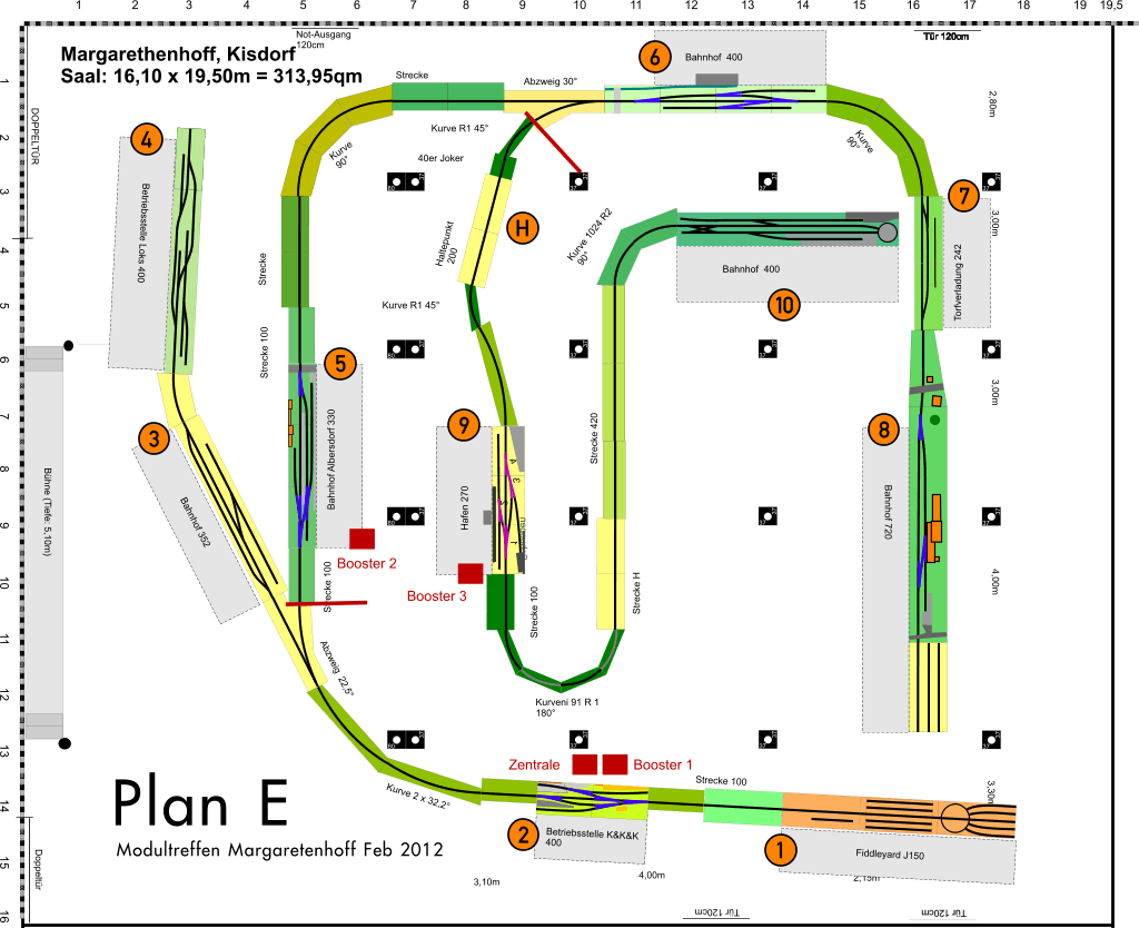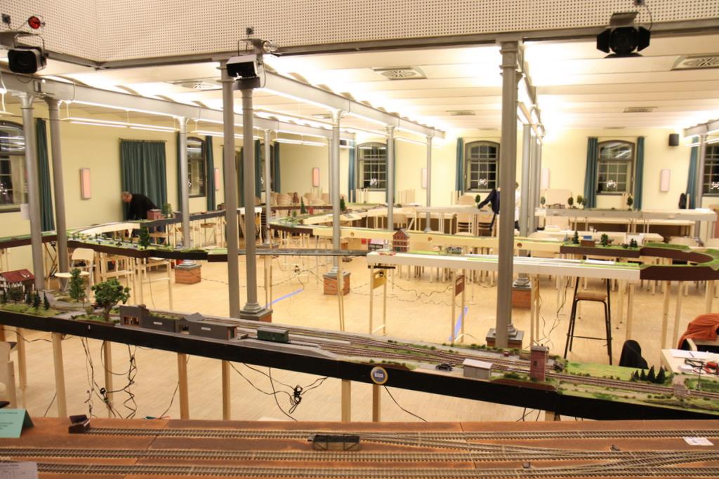 Obwohl ein Teilnehmer kurzfristig absagte und der Gleisplan geändert werden musste, und daher nicht ganz dem gezeigten Plan entsprach, hat das doch wunderbar geklappt, denn einige Teilnehmer hatten kurze „Jokermodule“ gebaut, mit denen das Arrangement um die vielen Säulen im Raum herumgeführt werden konnte.