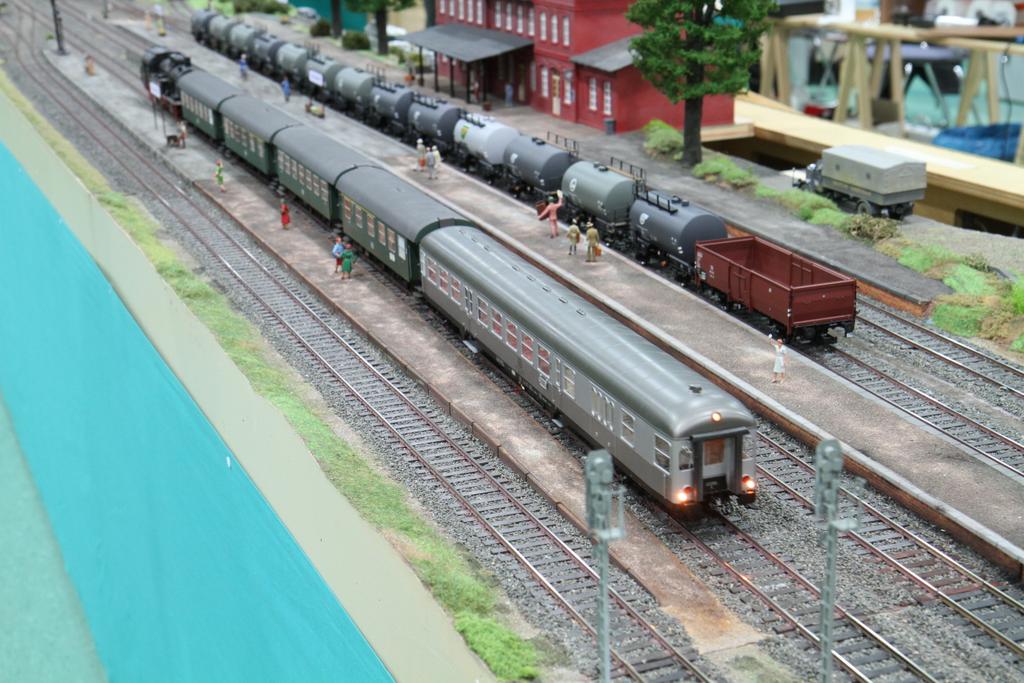Auf der Rundanlage waren immer wieder andere Garnituren unterwegs, manche im Analogbetrieb, aber die meisten fuhren digital. Als ich da war, rollte gerade eine Heljan Diesellok der DSB mit ihrem Güterzug und ein moderner Nahverkehrszug mit Doppelstockwagen. Auch die eine oder andere US-Lokomotive ließ sich blicken, jeder konnte aufgleisen, wozu er Lust hatte.